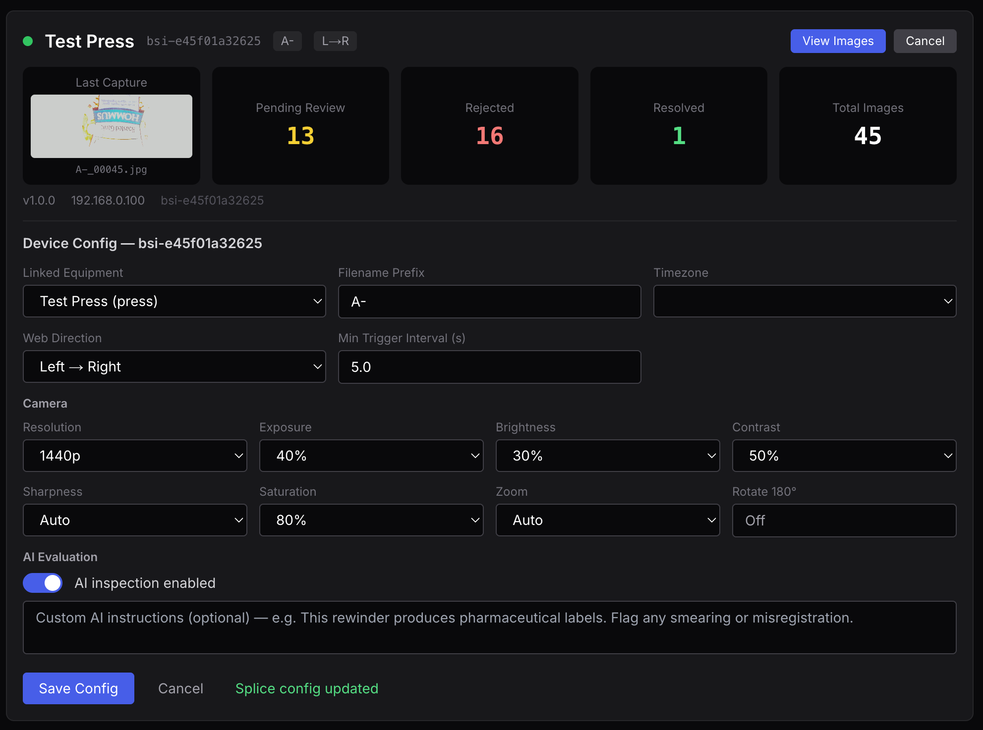The Splice Audit device mounts at your rewinder with a webcam pointed at the splice point. Every splice is automatically detected and captured, no operator interaction required. Images are uploaded to the cloud in real time for immediate access.