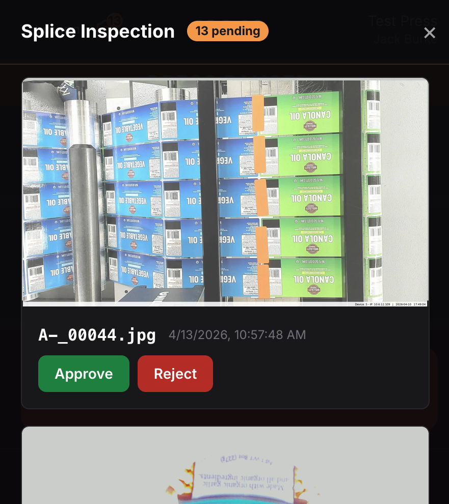 When paired with Data Collection, splice images are pushed directly to the operator's HMI at the press. Operators can see their splice images in real time, review them, and approve right from the tablet, adding another layer of accountability at the point of creation.