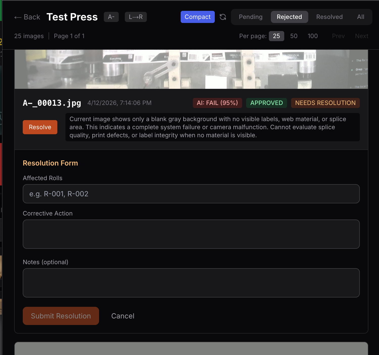QC inspectors review flagged splices through a structured workflow. Approve good splices, reject bad ones with a reason, and resolve rejections with corrective action notes. Every step is documented with who did it and when.